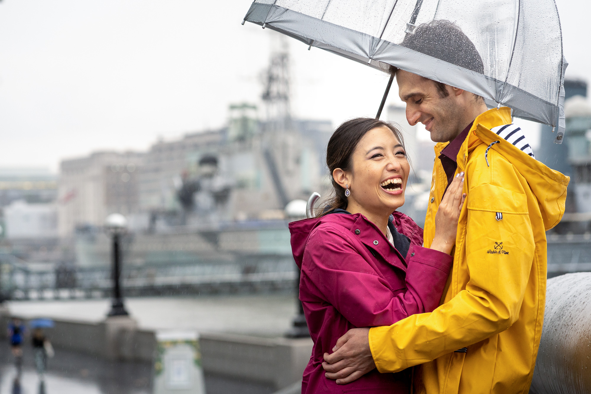 Instead of trying to “work around” the rain, think of how it can enhance the moment. Raindrops on the camera lens, reflective puddles on the pavement, you and your partner laughing under an umbrella, it’s all pure atmosphere.